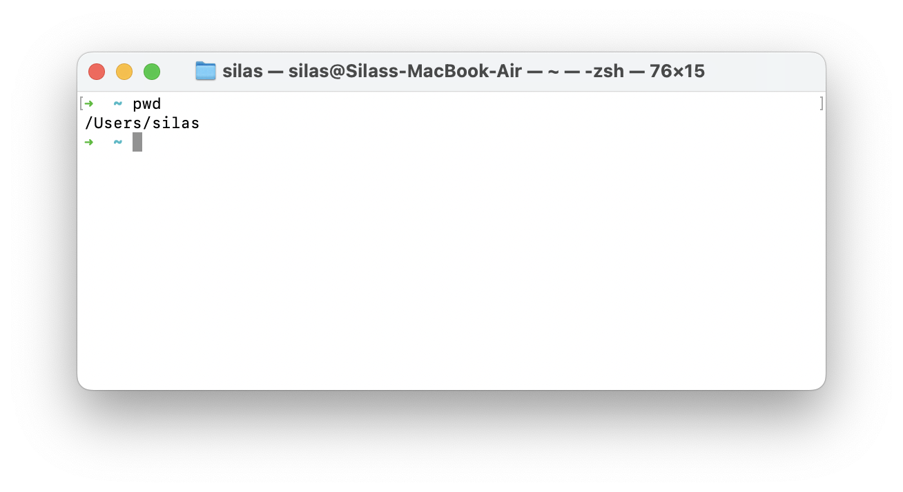 In diesem Terminal wird der aktuelle Pfad nur mit ~ dargestellt, was für das Home-Verzeichnis steht. In diesem Fall ist das der Ordner C:\Users\silas, weil wir uns im Benutzerkonto silas befinden. Diesen vollständigen Pfad sehen wir mithilfe des Befehls pwd.