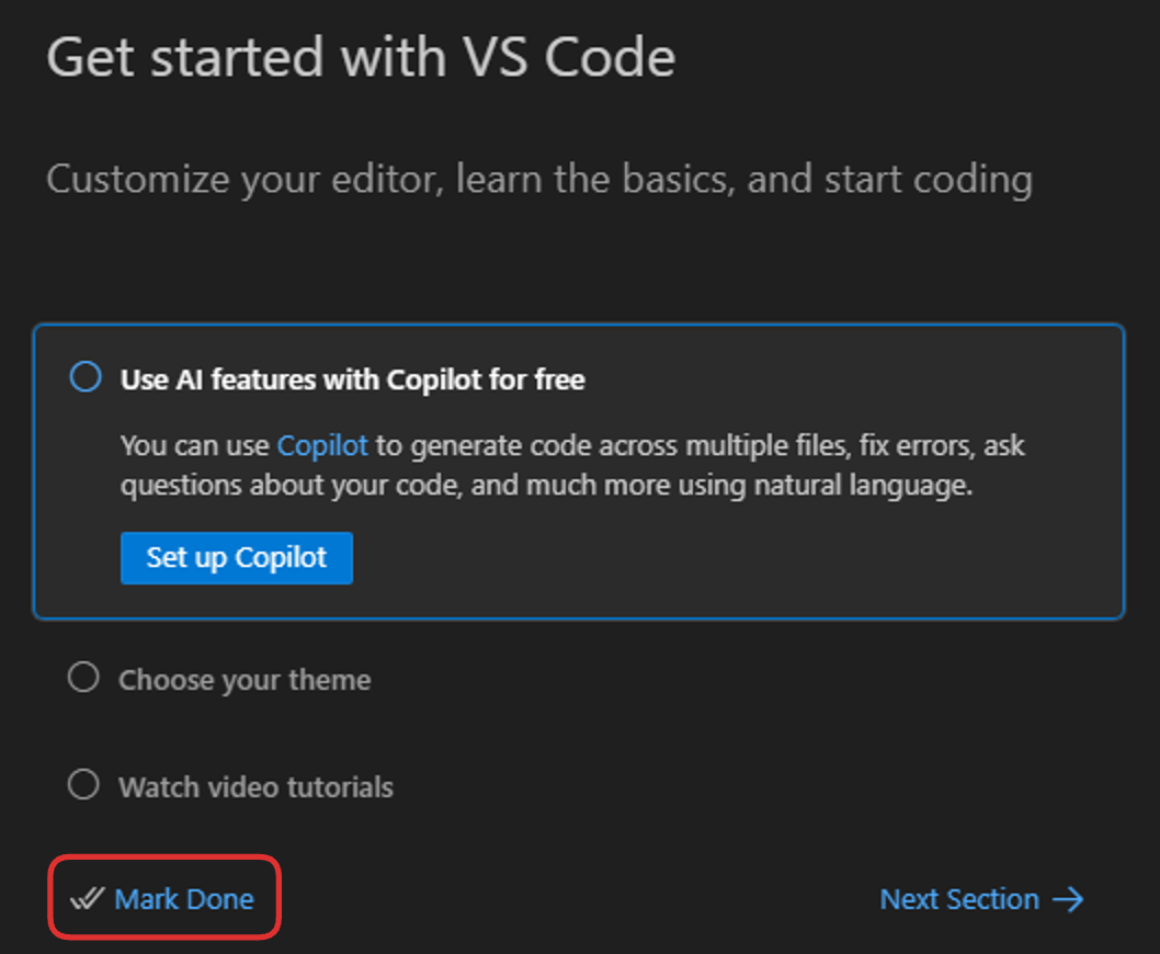 Womöglich erscheint anschliessend ein Bildschirm zur Ersteinrichtung von VSCode. Diesen können Sie einfach mit Mark Done schliessen, ohne die die angebotenen Optionen anzuwählen: