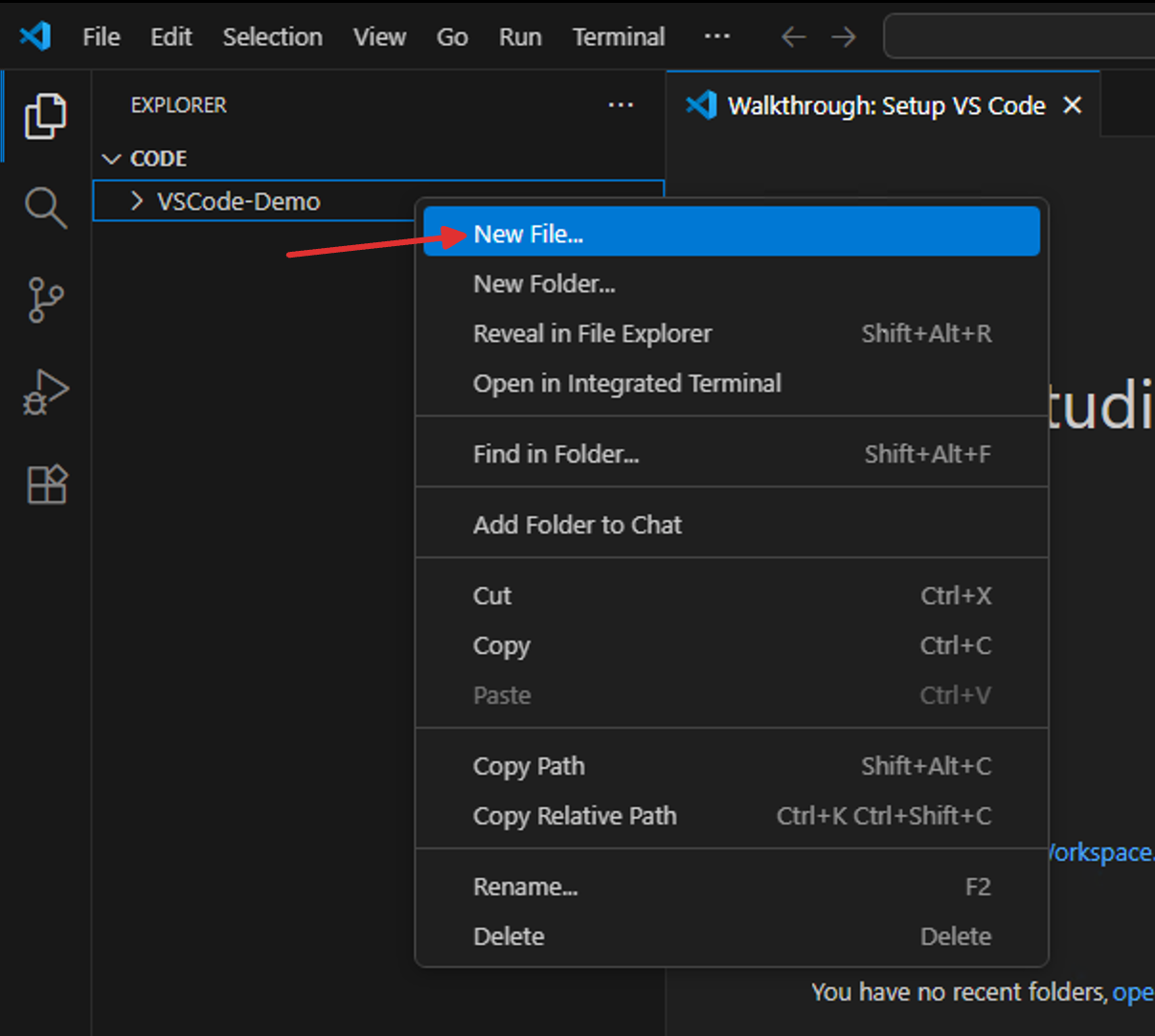 Nun erstellen Sie links im Explorer direkt im Ordner VSCode-Demo eine neue Datei ( Rechtsklick in den leeren Bereich unter dem Ordnernamen → New File…):
