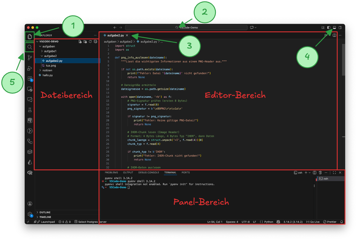 In diesem Abschnitt lernen Sie die wichtigsten Funktionen von Visual Studio Code (VSCode) kennen. Sie müssen hier noch nichts selbst ausprobieren – das machen Sie im nächsten Abschnitt, in dem Sie Ihr erstes kleines Programm in VSCode schreiben und ausführen. Dieser Abschnitt dient als Anleitung und als Referenz für später.