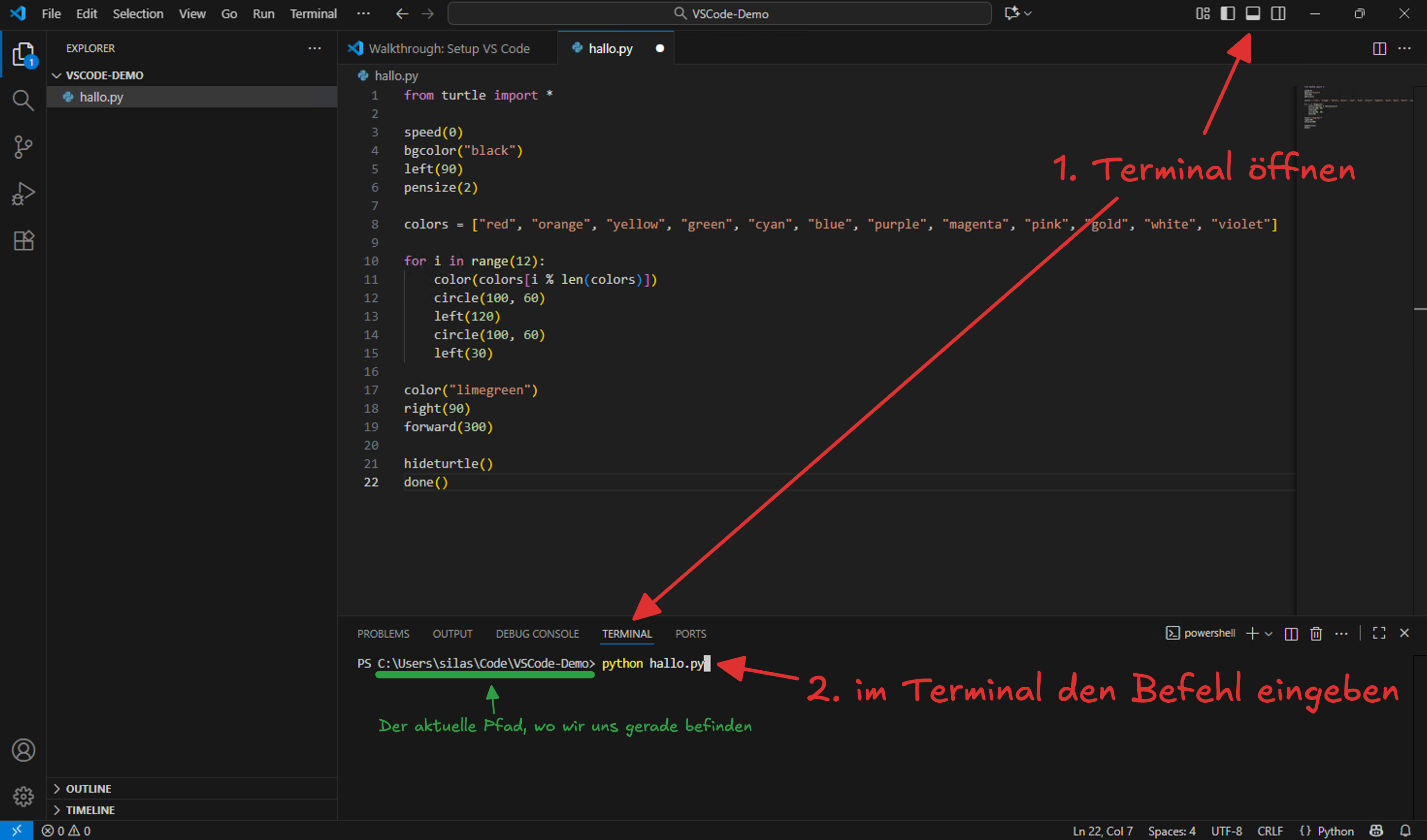 Hier sagt uns das Terminal, dass wir uns aktuell im Ordner C:\Users\silas\Code\VSCode-Demo befinden. Mit dem Befehl cd aufgaben_turtle wechseln wir in den Unterordner aufgaben_turtle, der sich im aktuellen Ordner befindet. Das Terminal zeigt uns danach an, dass wir uns nun im Ordner C:\Users\silas\Code\VSCode-Demo\aufgaben_turtle befinden.