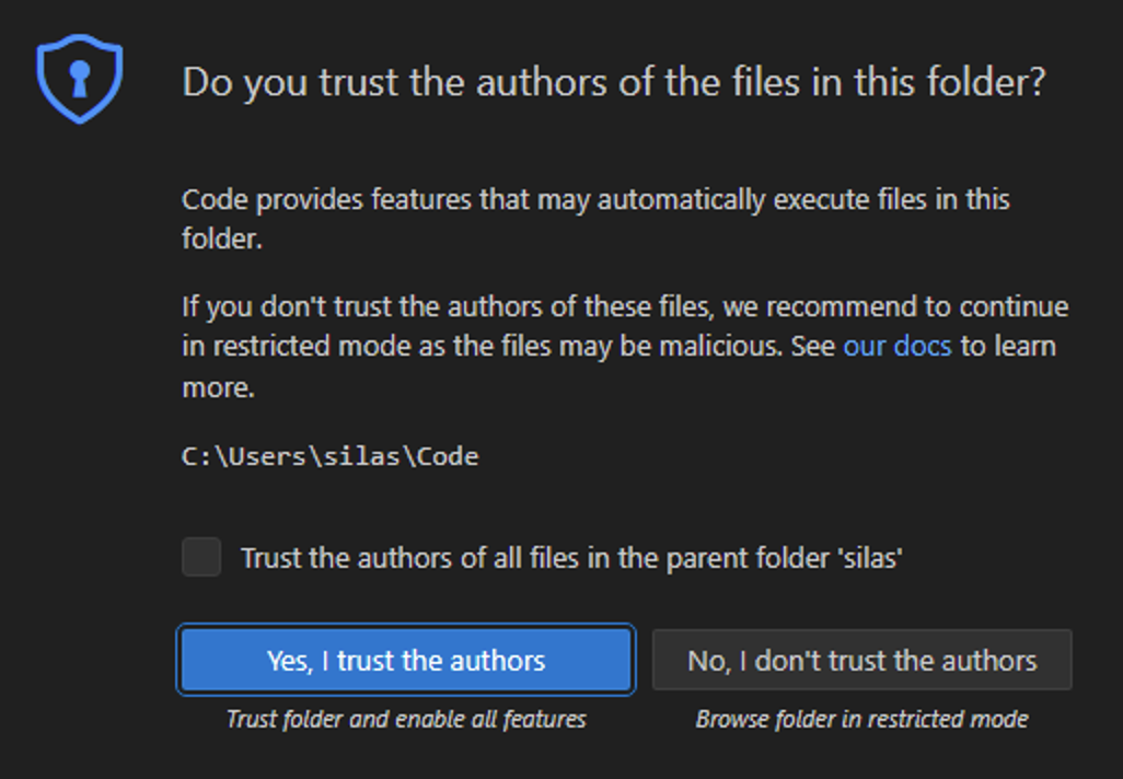 Falls Sie gefragt werden, ob Sie dem Ordner vertrauen wollen, klicken Sie auf Yes, I trust the authors: