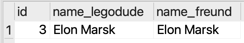 Bevor Sie etwas löschen, führen Sie anschliessend eine SELECT-Abfrage durch, die alle Freunde von Elon anzeigt (Sie können dazu Ihre Abfrage aus der vorherigen Aufgabe kopieren und anpassen). Wichtig ist, dass Sie diesmal auch die ID der Freundschaftsbeziehung ausgeben lassen, denn die brauchen Sie anschliessend fürs Löschen. Es sollte genau ein Eintrag angezeigt werden: