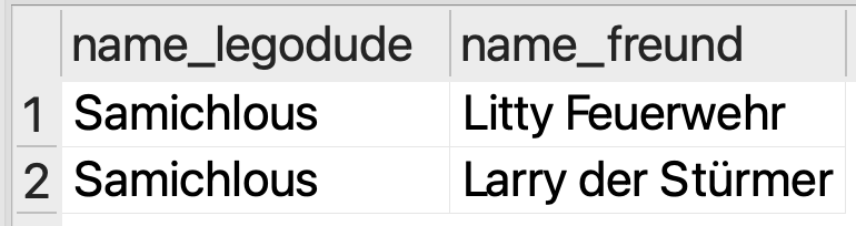 In der Datenbank sind Freundschaftsbeziehungen gegenseitig: Wenn A mit B befreundet ist, dann ist B auch mit A befreundet. Es ist also egal, ob Sie Ueli jeweils als den «Legodude» oder als den «Freund» in der Freundschaftsbeziehung erfassen.