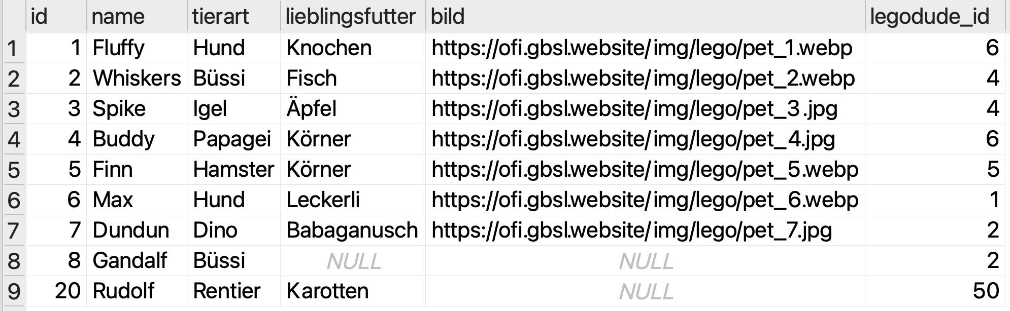 Ein Beispiel: Wir möchten in der haustiere-Tabelle eine Katze namens Gollum einfügen. Gollums Lieblingsfutter kennen wir nicht und ein Bild haben wir ebenfalls keins, also lassen wir diese Angaben weg. Gollum gehört zum Legodude mit der ID 2. Eine ID für die neue Katze müssen wir auch noch festlegen: Wir wählen einfach die nächste noch nicht verwendete Zahl, also die 8 (da die IDs 1 bis 7 in dieser Tabelle bereits vergeben sind), wobei grundsätzlich jede noch nicht verwendete Zahl erlaubt wäre. Unsere SQL-Abfrage sieht dann so aus: