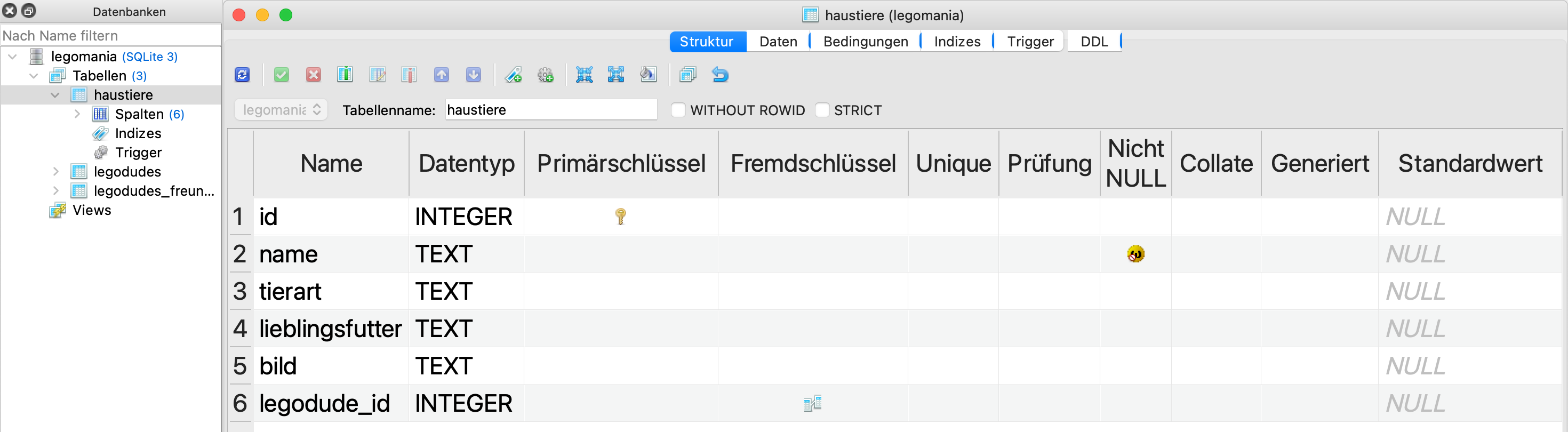legodude_idist als Fremdschlüssel markiert. Das bedeutet, dass die Werte in dieser Spalte mit den Primärschlüssel-Werten in einer anderen Tabelle (in diesem Falllegodudes.id) übereinstimmen müssen, sofern wir einen Wert angeben.