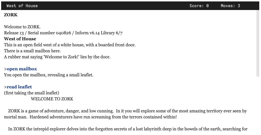 Sie können eine Nachbildung von Zork 👉 hier online spielen. Probieren Sie's aus!
