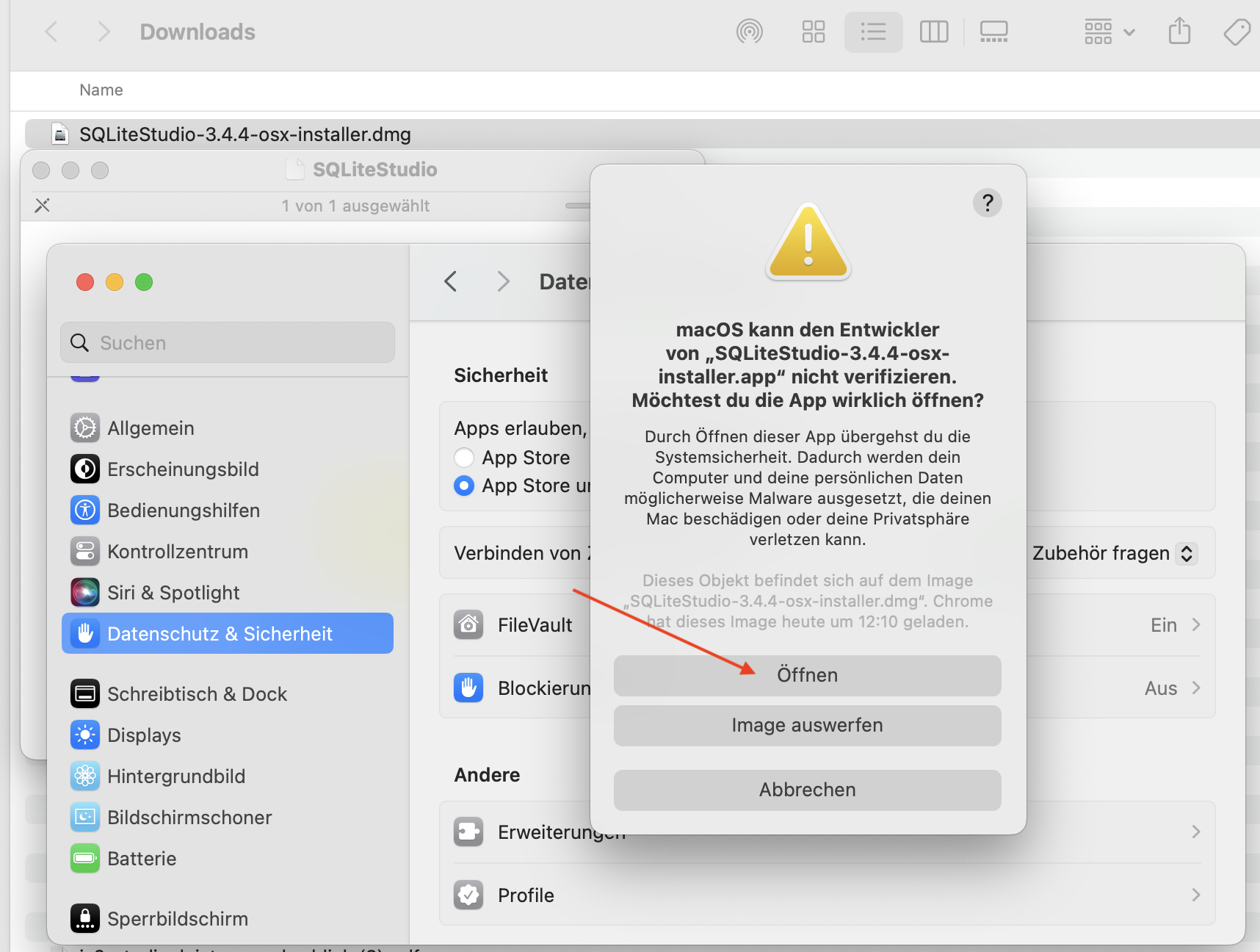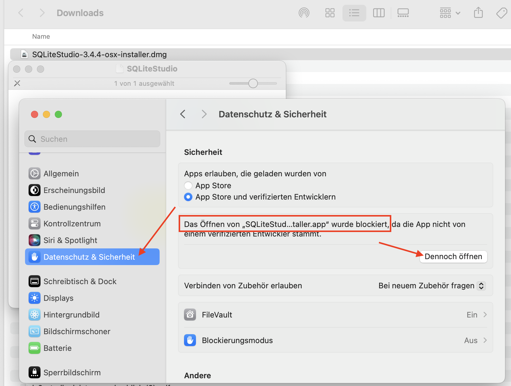 - Sie erhalten dabei vermutlich eine Fehlermeldung, weil das Programm nicht von einem verifizierten Entwickler stammt. Öffnen Sie in dem Fall Ihre Systemeinstellungen, gehen Sie zu Datenschutz & Sicherheit, suchen Sie den Eintrag wie im Bild gezeigt, und klicken Sie dort auf "Dennoch öffnen":