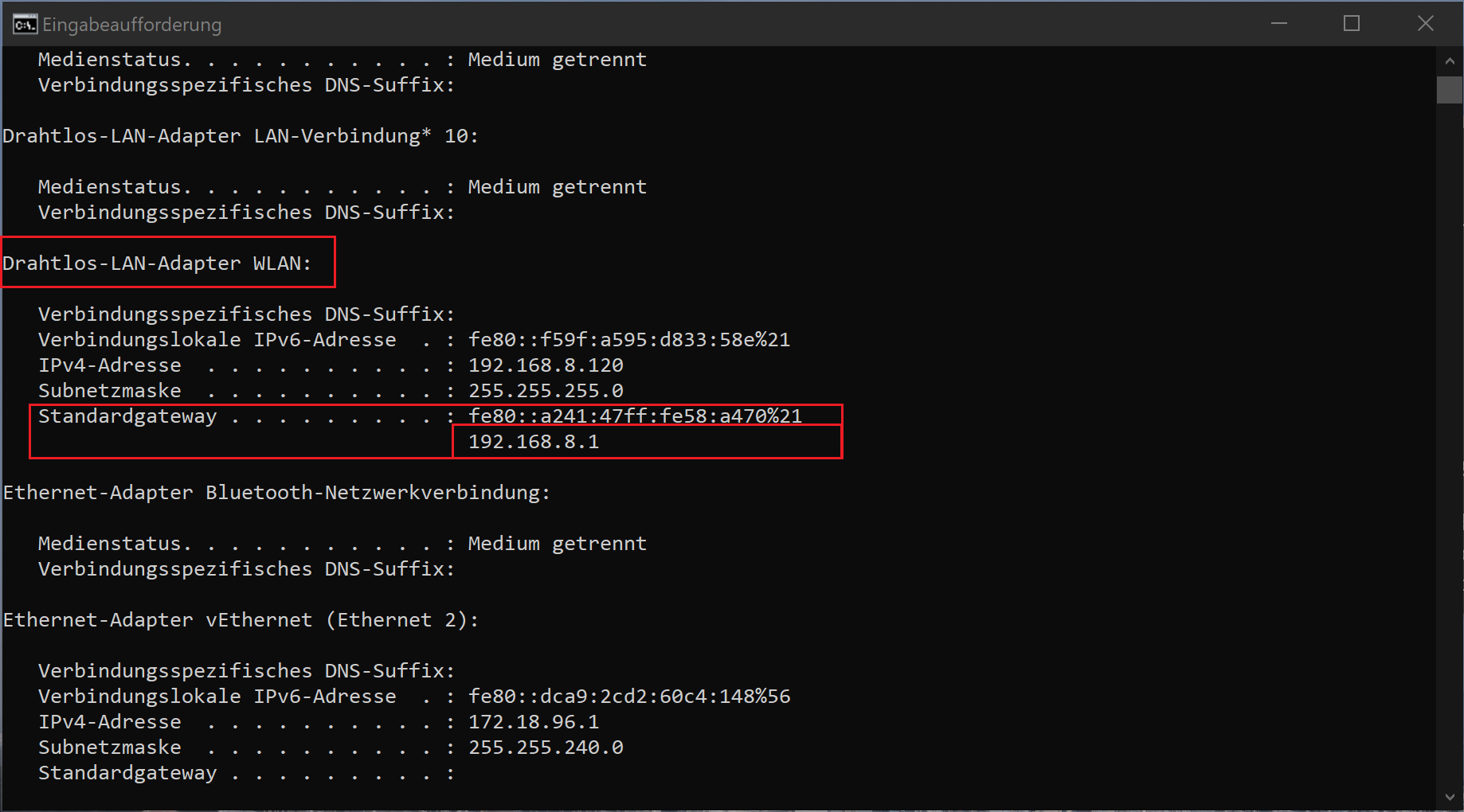 Falls Sie ihr aktuelles Standardgateway noch nicht kennen, dann finden Sie es jetzt heraus. Halten Sie das Ergebnis für die nächste Aufgabe zur Hand.