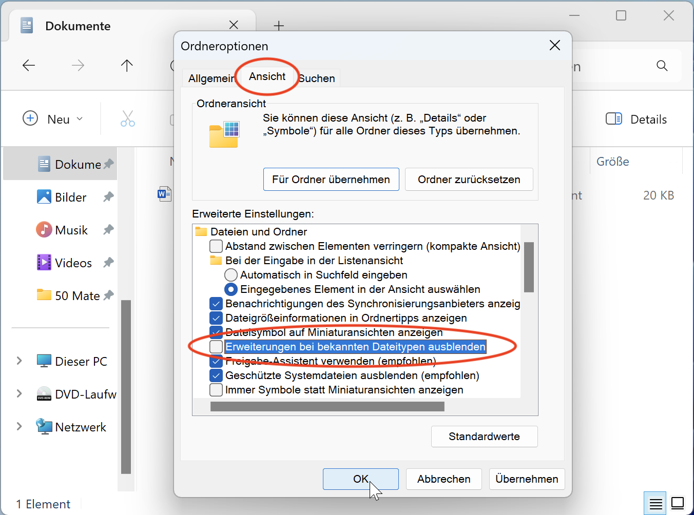 Anschliessend werden im Windows Explorer alle Dateiendungen angezeigt.