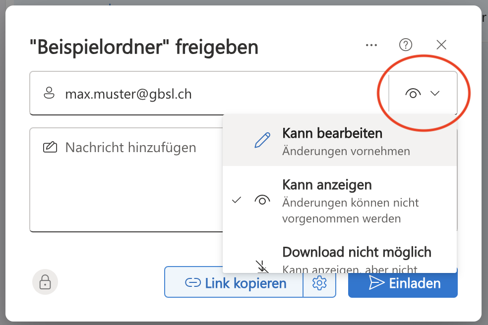 - Anschliessend können Sie auswählen, welche Berechtigungen Personen haben sollen, die über den Link verfügen (anzeigen und bearbeiten, oder nur anzeigen):