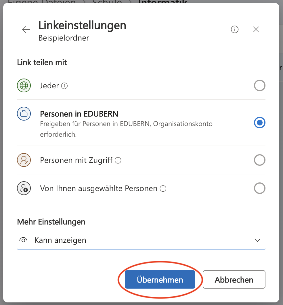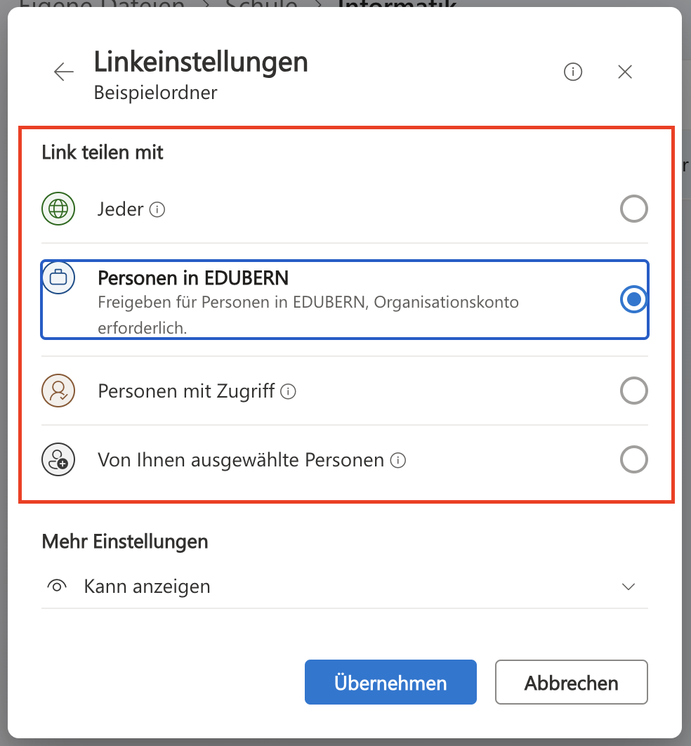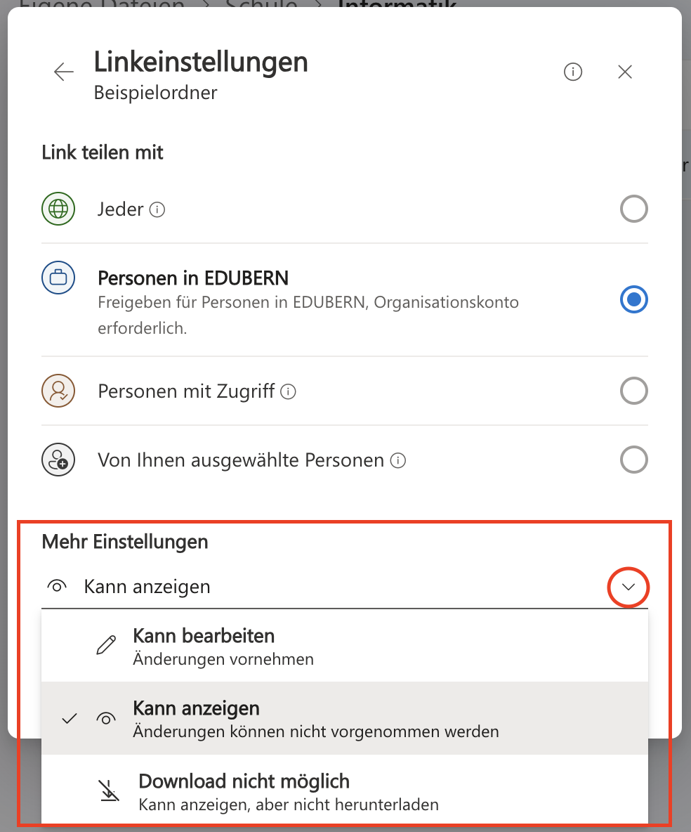 - Oben können Sie einstellen, wer diesen Link verwenden können soll. Wenn Sie den Link nur für Personen innerhalb Ihrer Schule freigeben wollen, dann setzen Sie diese Option auf Personen in EDUBERN. Wenn auch Personen ohne Schulkonto den Link verwenden können sollen, dann wählen Sie Jeder.