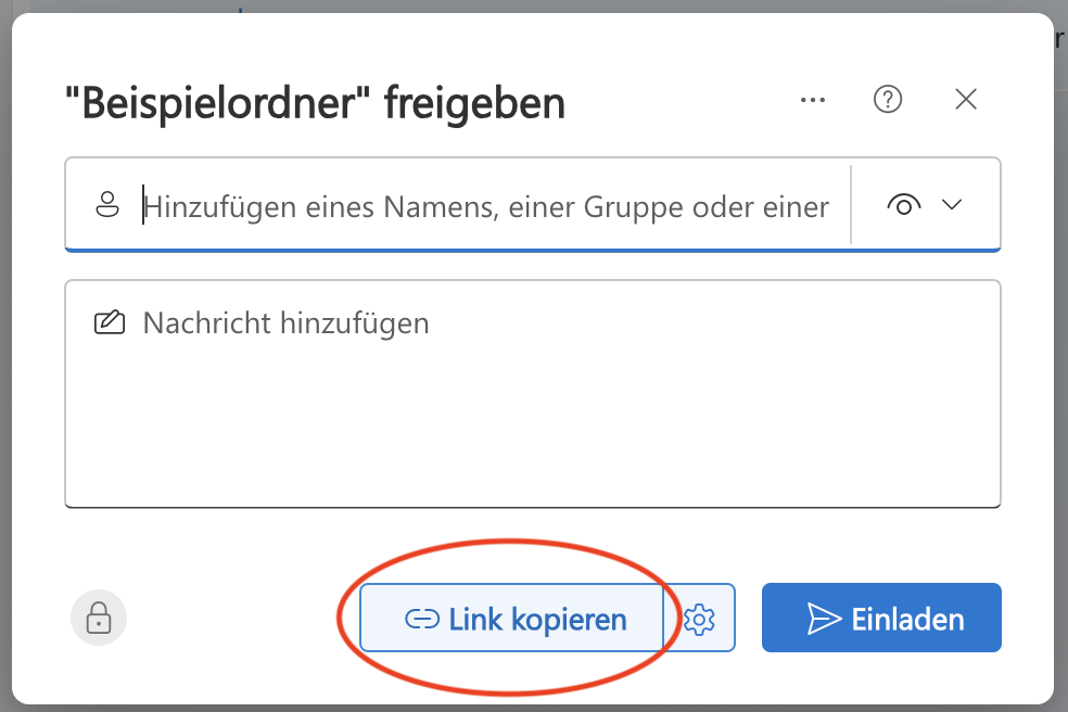 - Klicken Sie zum Schluss auf Link kopieren. Den kopierten Link können Sie nun zum Beispiel ins OneNote kopieren, damit Sie ihn nicht verlieren. Jetzt können Sie ihn an alle Personen versenden, die Zugriff auf diesen Order erhalten sollen.