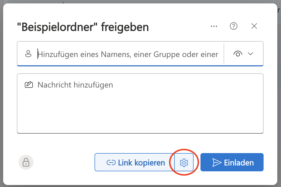 - Klicken Sie zuerst auf das Zahnrad-Symbol, um die Optionen für den Freigabelink anzupassen: