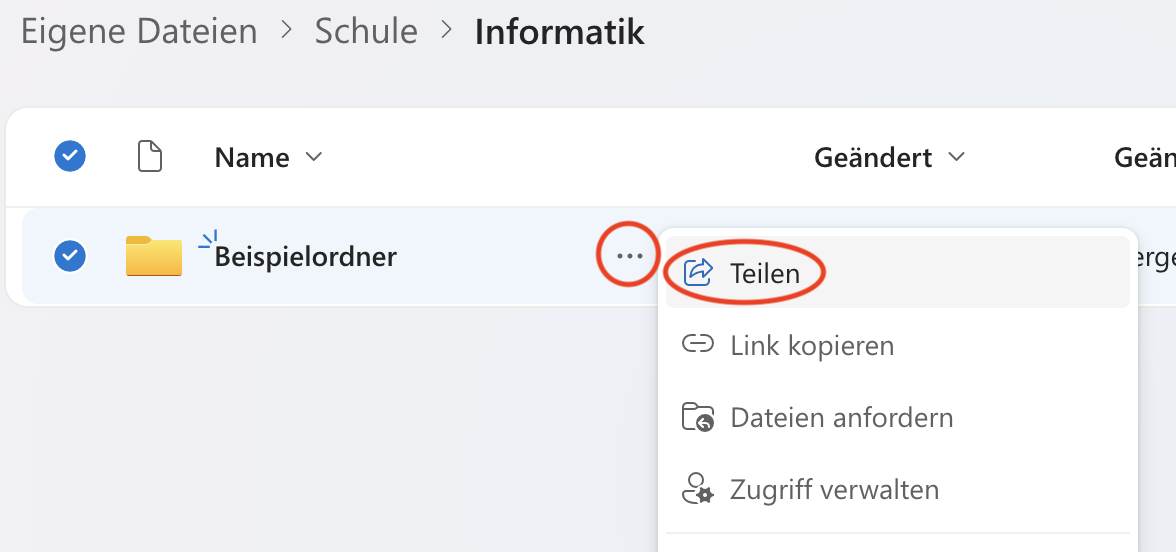 - Klicken Sie auf die drei Punkte neben dem Namen des Ordners, und dann auf Teilen: