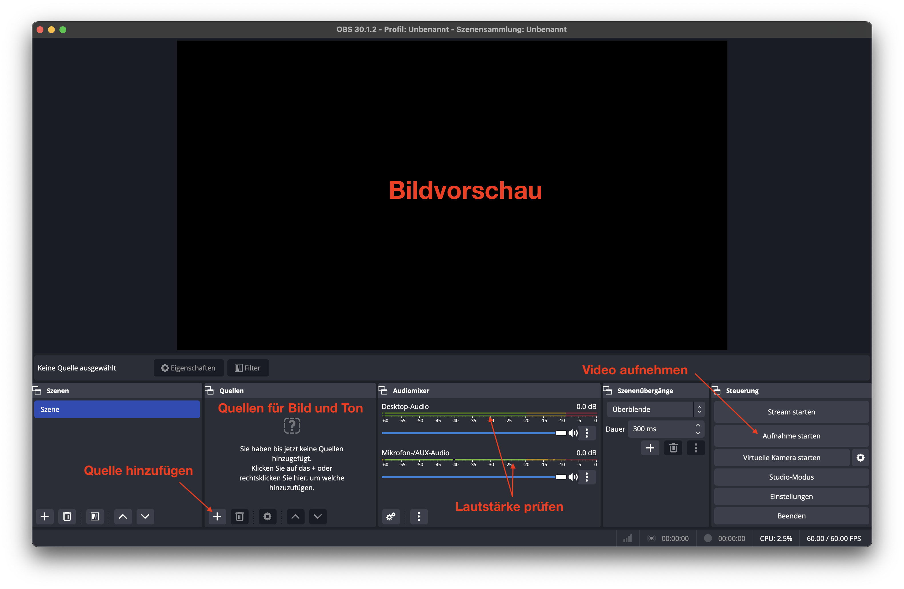 Hier sehen Sie eine Übersicht über die wichtigsten Bedienelemente von OBS: