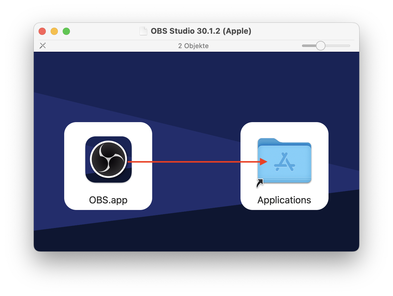 obs-studio-[...].dmg) und führen Sie sie aus (Doppelklick auf die Datei). - Ziehen Sie die OBS.app-Kachel auf die Applications-Kachel: