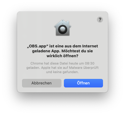 - Öffnen Sie OBS. Vermutlich erhalten Sie dabei folgende Meldung, bei der Sie einfach auf Öffnen klicken: