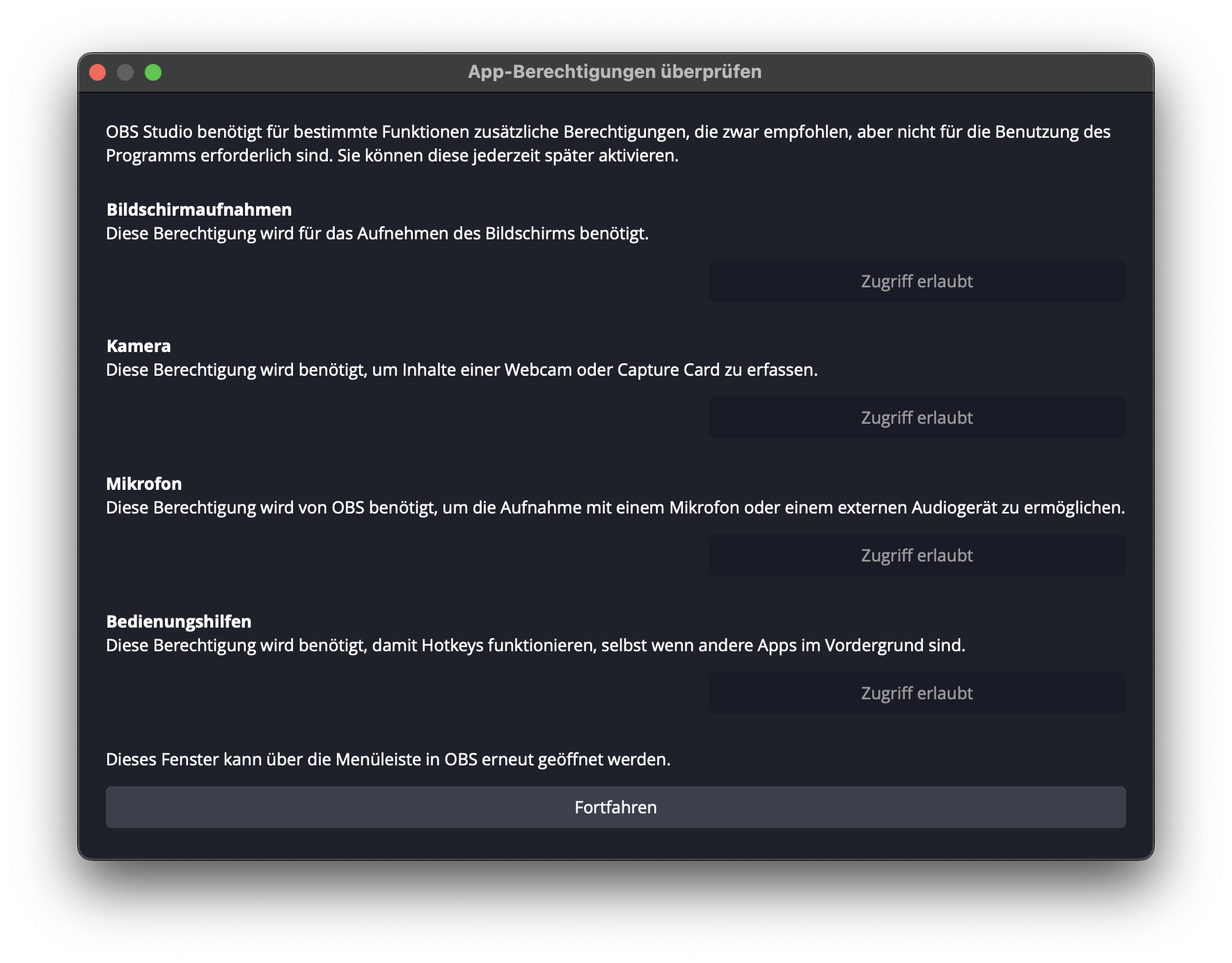 - Prüfen Sie bei diesem Fenster anschliessend, ob OBS alle nötigen Berechtigungen hat. Wenn rechts Zugriff erlaubt steht, dann ist die entsprechende Berechtigung erteilt.