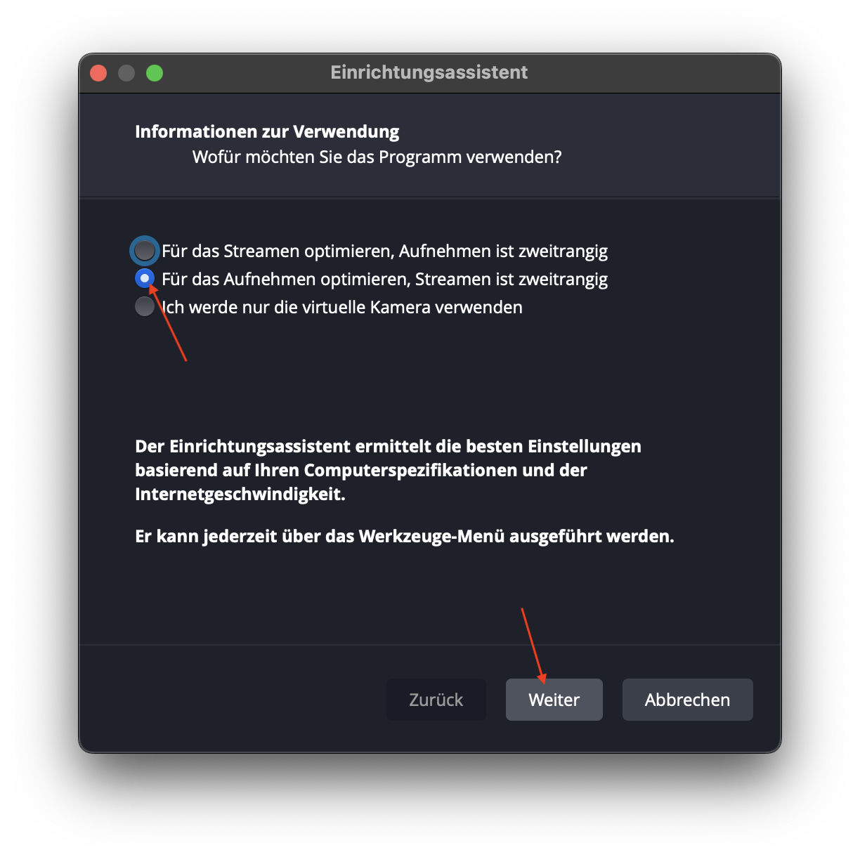 - Wählen Sie hier die Option Für das Aufnehmen optimieren aus und klicken Sie auf Weiter: