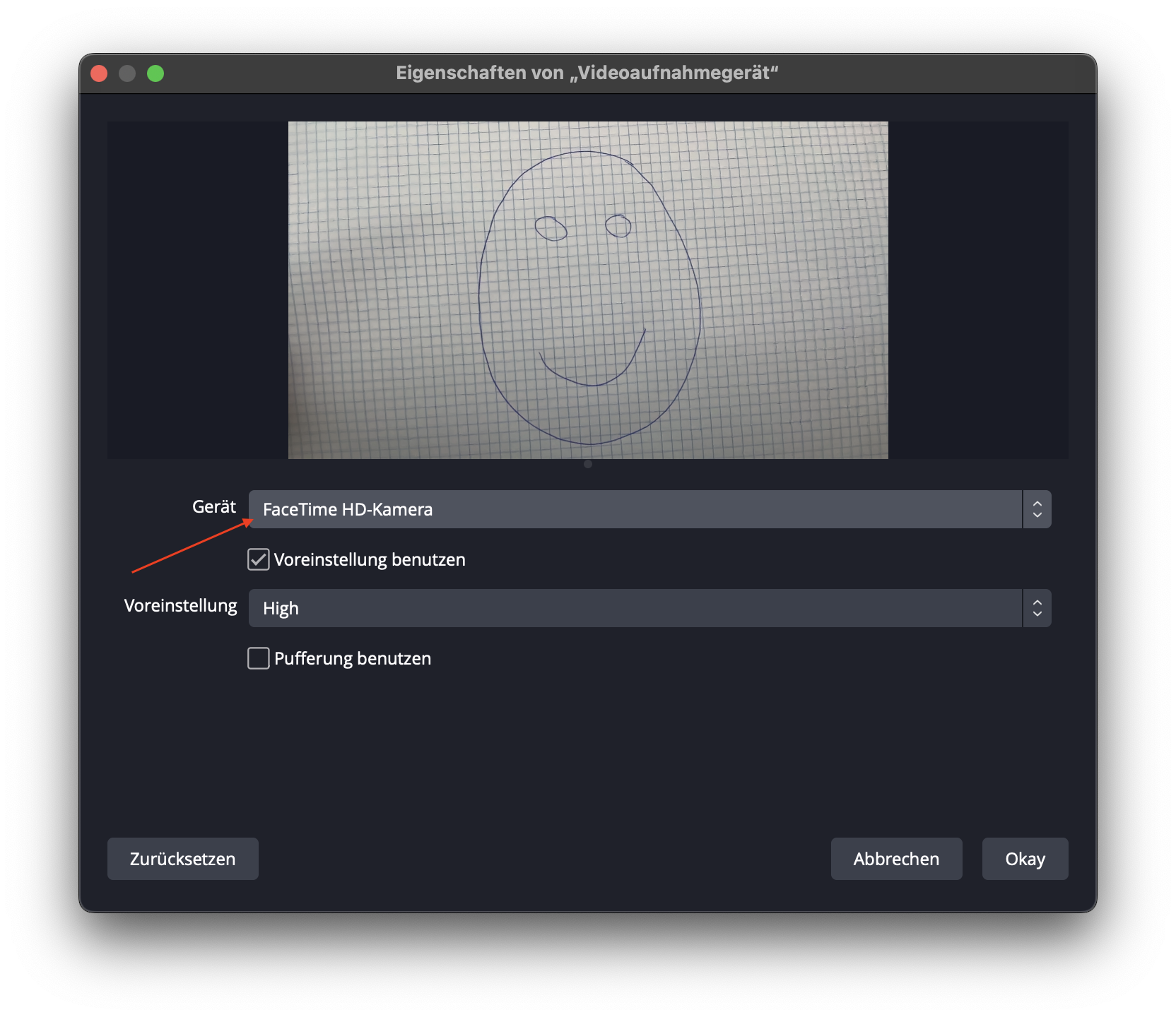 Wählen Sie im darauffolgenden Dialog beim Dropbdown-Menu Gerät Ihre Webcam aus. Unter macOS heisst die Webcam z.B. meistens FaceTime HD-Kamera. Belassen Sie die restlichen Einstellungen unverändert und klicken Sie auf Okay.