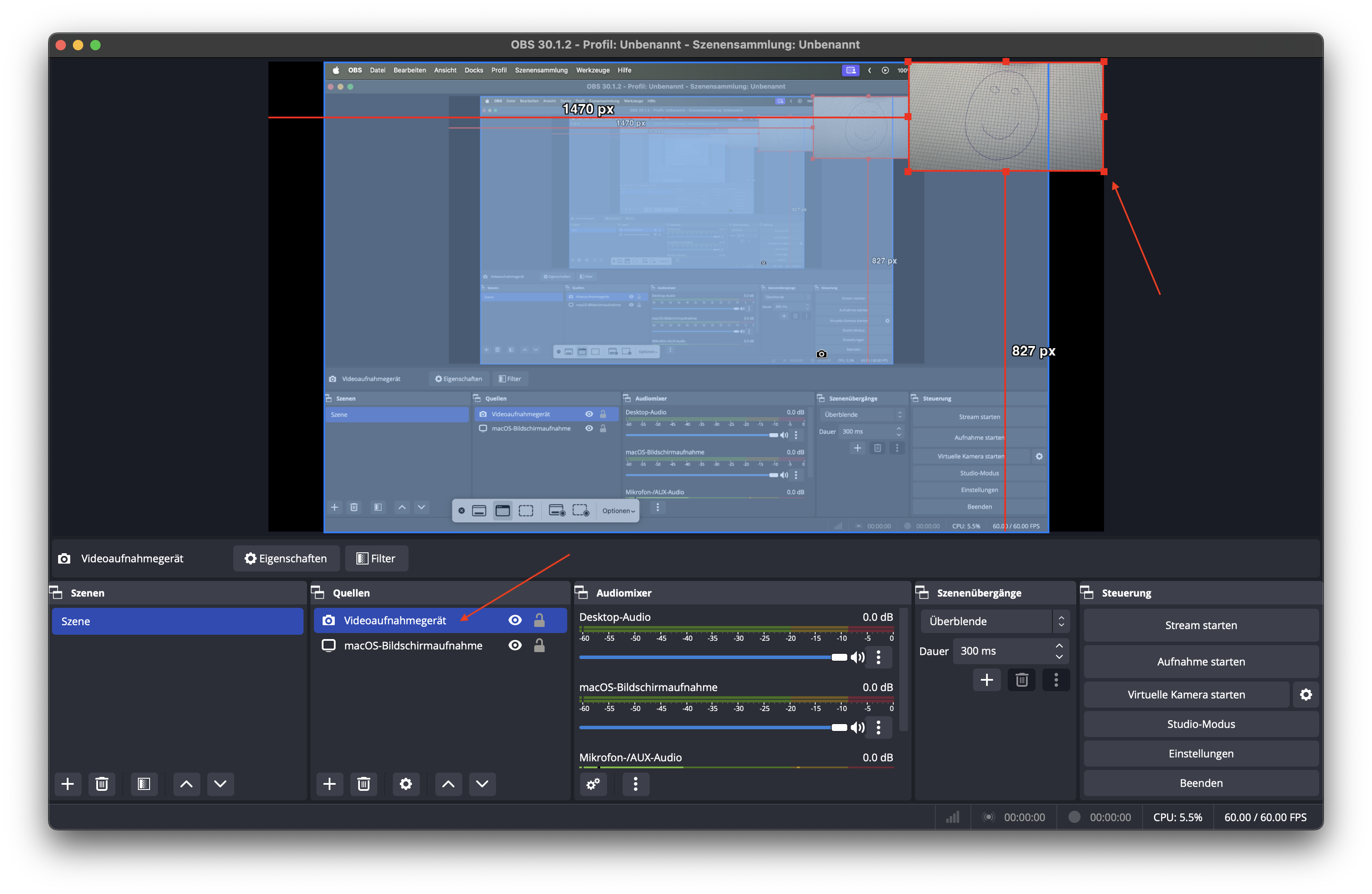 Die Grösse des Videos können Sie nun auch wieder mit dem roten Rahmen anpassen. Stellen Sie dazu sicher, dass Sie die korrekte Quelle ausgewählt haben (siehe Quellen unten). Stellen Sie zudem sicher, dass in der Quellen-Liste die Videoaufnahme oberhalb der Bildschirmaufnahme steht.