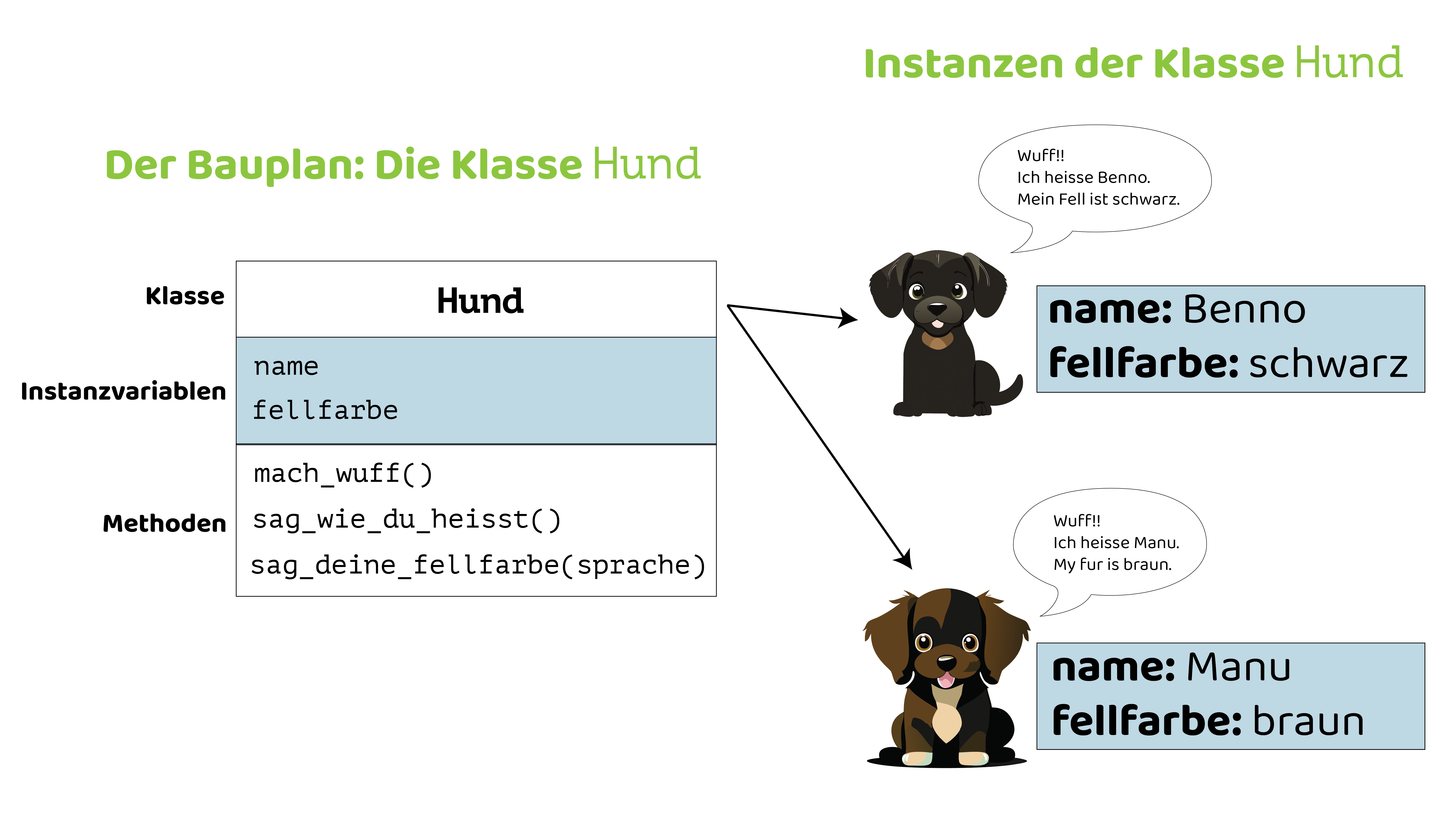 • Die Variable manu enthält nun also ein Objekt vom Datentyp Hund — sprich, eine Instanz der Hund-Klasse.