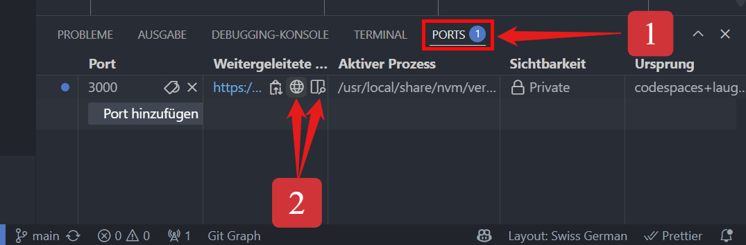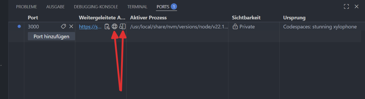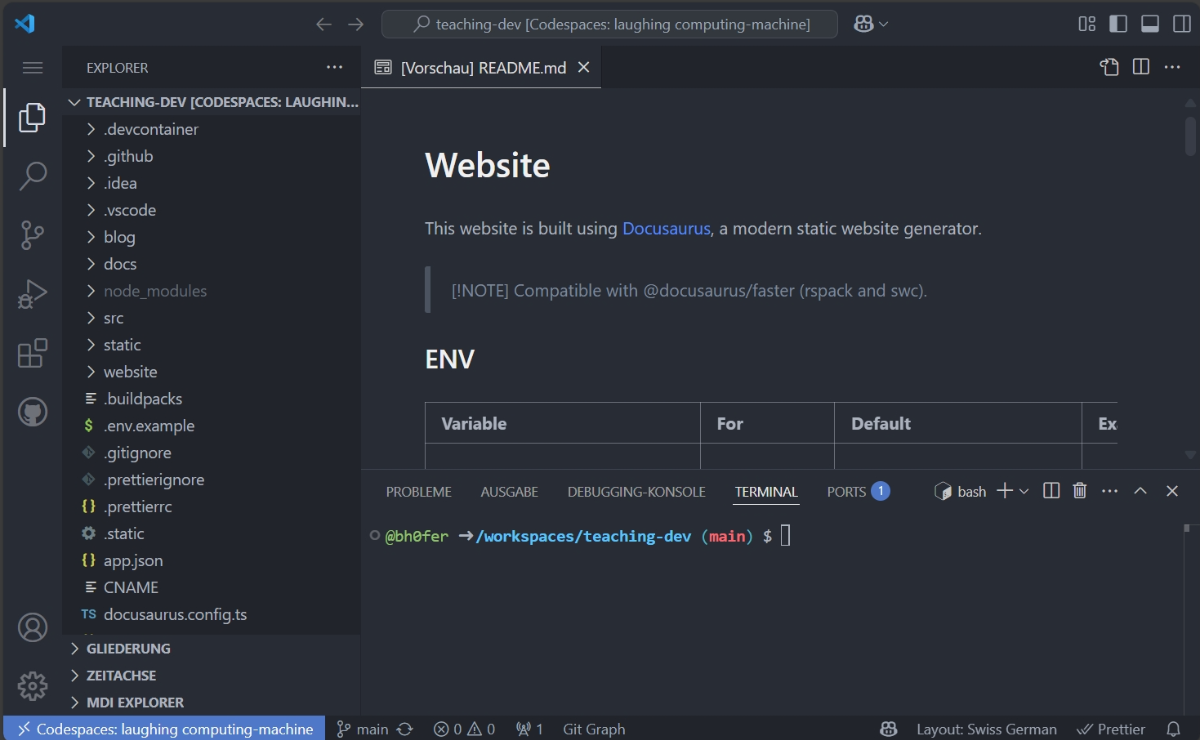 Wenn der Codespace bereit ist (ca. 1-2 Minuten), sollte die Seite so aussehen: