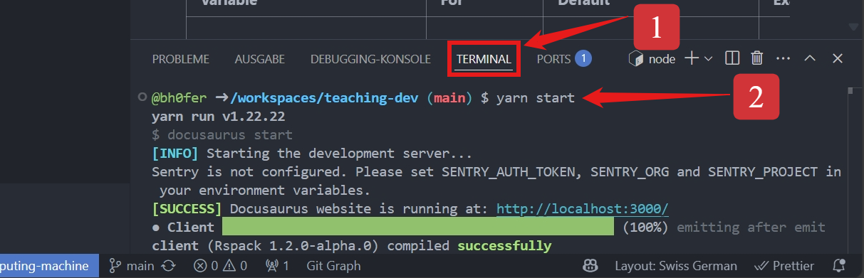 Um die Möglichkeiten von der Unterrichtswebseite auszuprobieren, ohne auf dem eigenen Computer etwas zu installieren, können 👉 GitHub Codespaces verwendet werden.